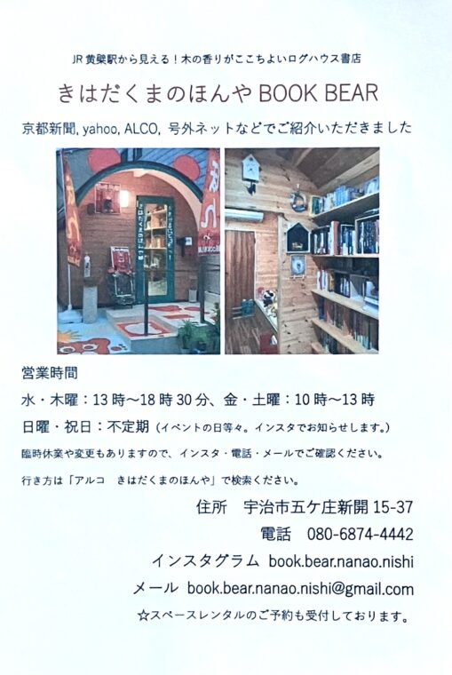 JR黄檗駅から見える、ログハウスの書店です。お近くにお越しの際は、ぜひお立ち寄りください!