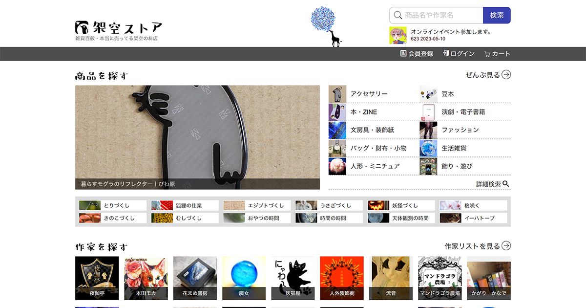 架空ストア様は、個人の作家様が制作された雑貨全般を委託販売される雑貨店です。ハンドメイドの品はもちろん、ファッション小物、アクセサリー、ステーショナリーに、同人誌やリトルプレスなどの書籍も扱っていらっしゃるオンラインストアです。